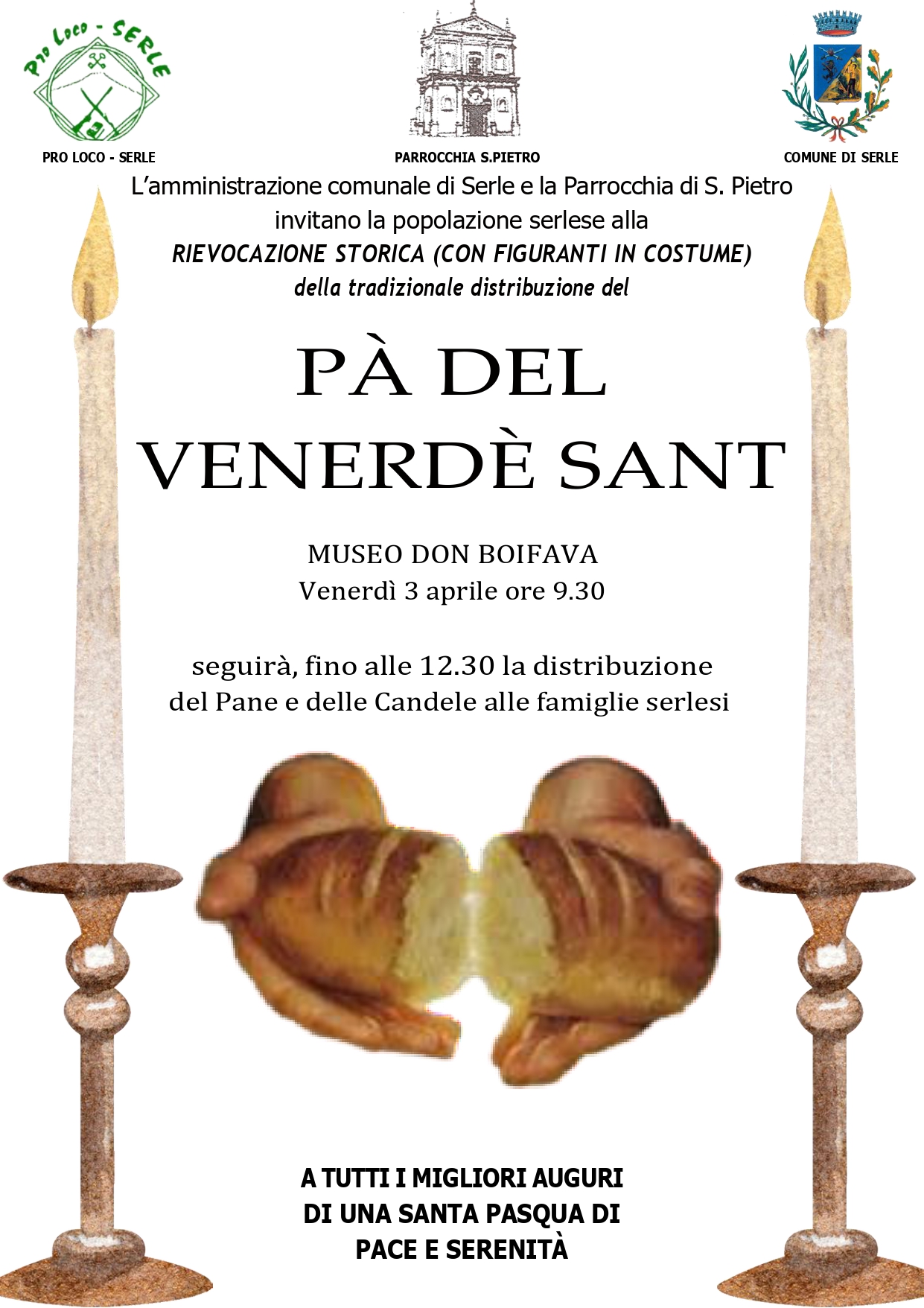 Si avvisa la cittadinanza che l'Amministrazione comunale di Serle e la Parrocchia di S. Pietro, in collaborazione con l'Associazione Pro loco, invitano la popolazione serlese alla rievocazione storica della tradizionale distribuzione del Pà del Venerdè Sant, in...