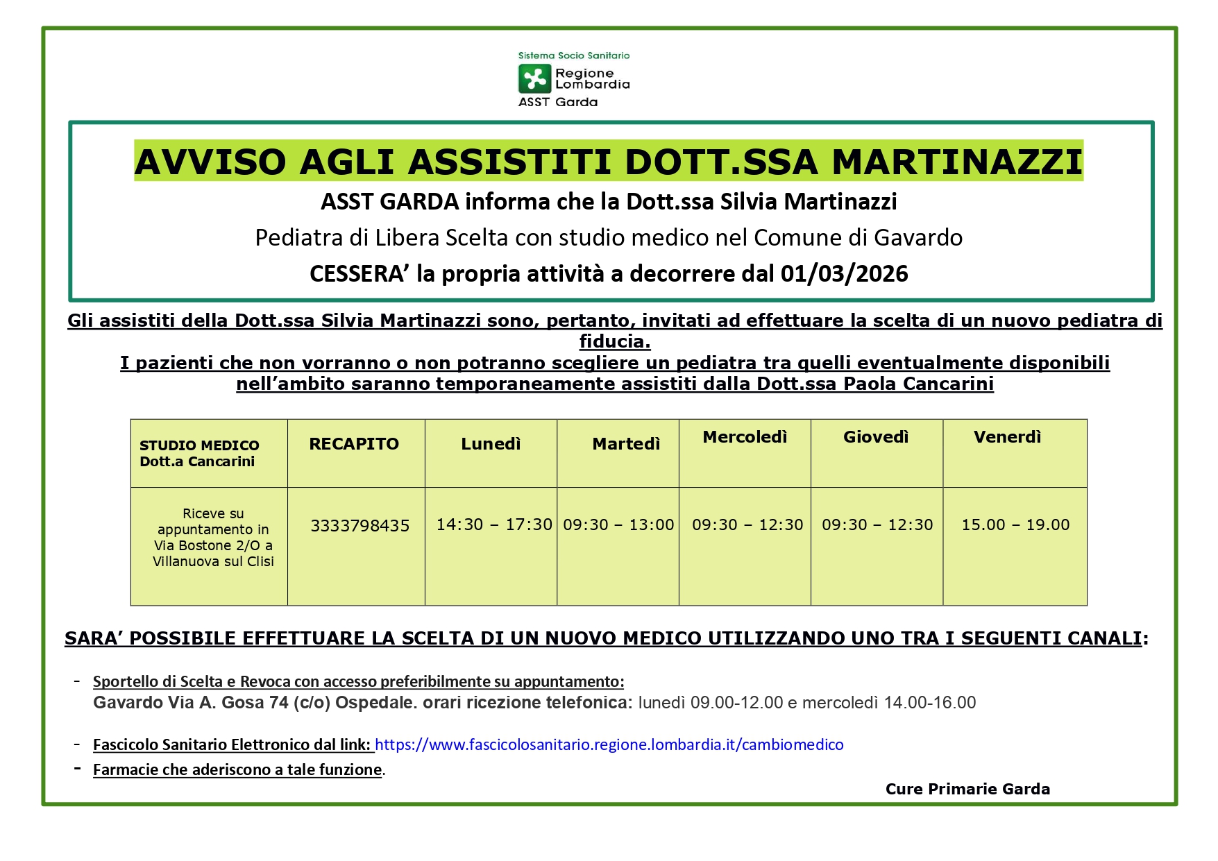 Si rende noto che la Dott.ssa Silvia Martinazzi, Pediatra di Libera Scelta Titolare, dal 01/03/2026 cesserà la propria attività...