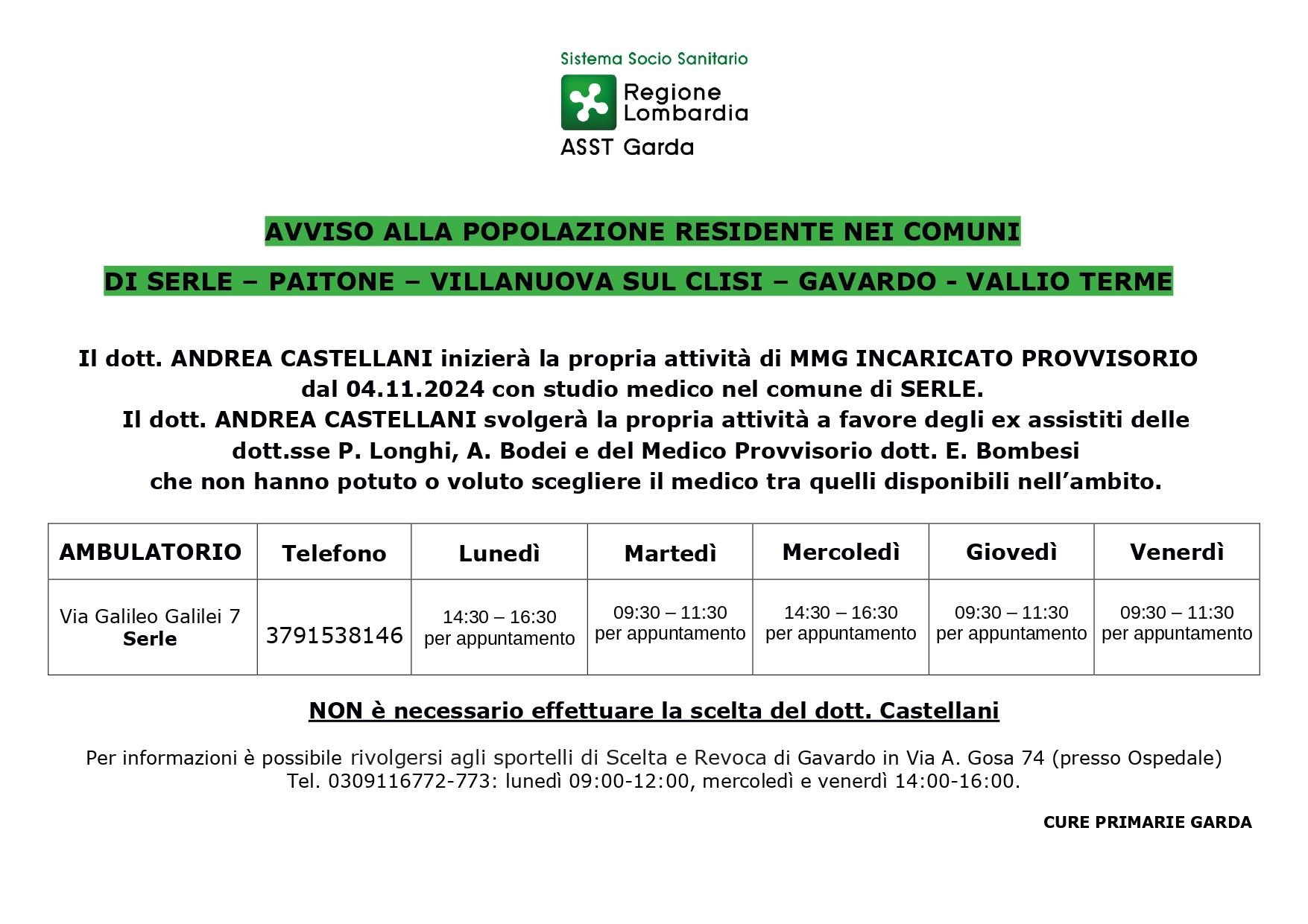 Il dott. Andrea Castellani inizierà la sua attività di Medico di Medicina Generale (MMG). Con incarico provvisorio dal 4 novembre 2024 a Serle, presso lo studio di via Galileo Galilei 7. Si occuperà degli ex assistiti delle dott.sse P. Longhi, A. Bodei e del dott. E. Bombesi.