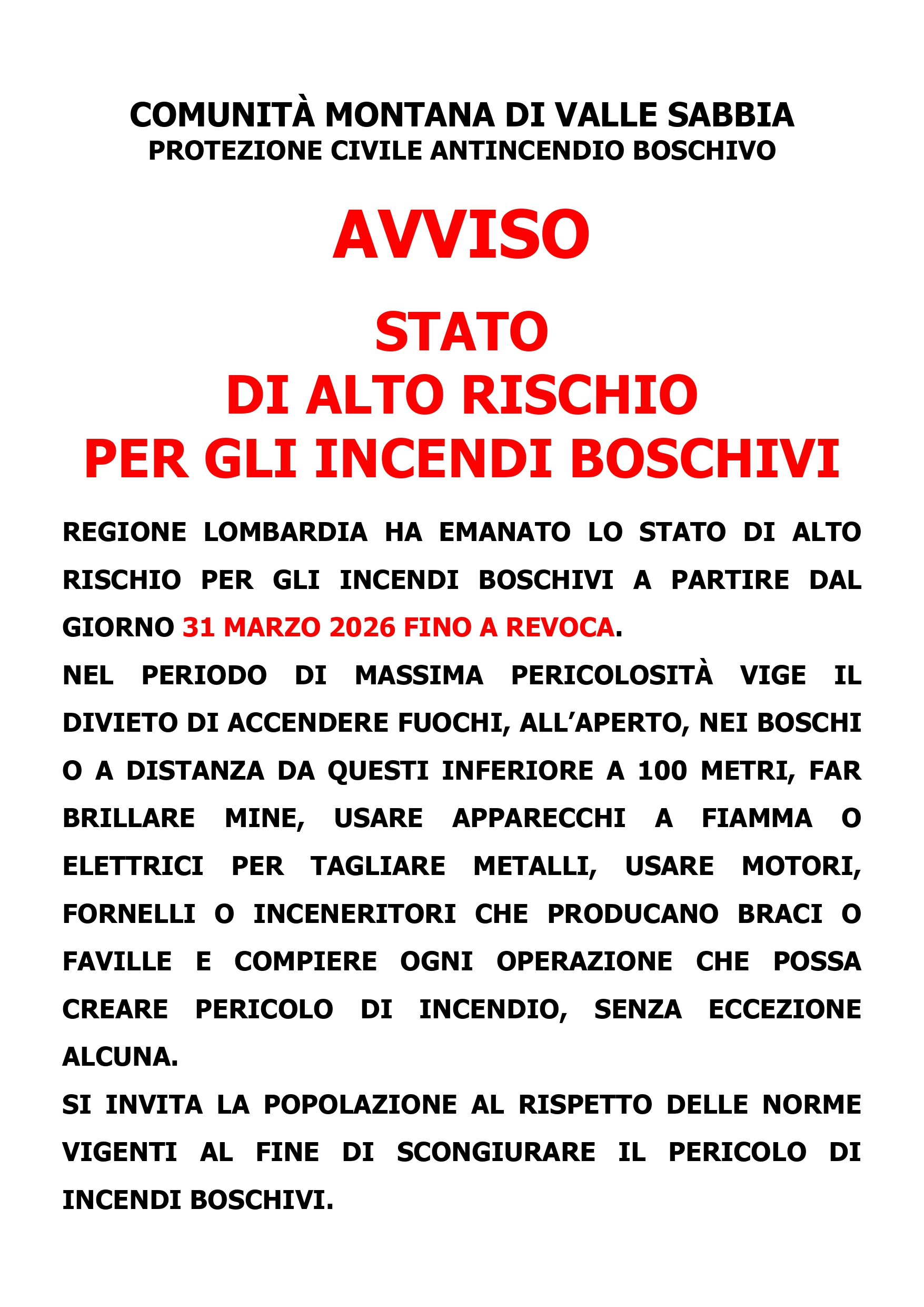 Si avvisa la cittadinanza che nel periodo di ALTO RISCHIO PER GLI INCENDI BOSCHIVI vige, nei boschi o a distanza inferiore a 100 metri, il divieto di accendere fuochi, all’aperto, far brillare mine, usare apparecchi a fiamma o elettrici per tagliare metalli, usare motori, fornelli o inceneritori che producano braci o faville e compiere operazioni che possano creare pericolo di incendio, senza eccezione alcuna;