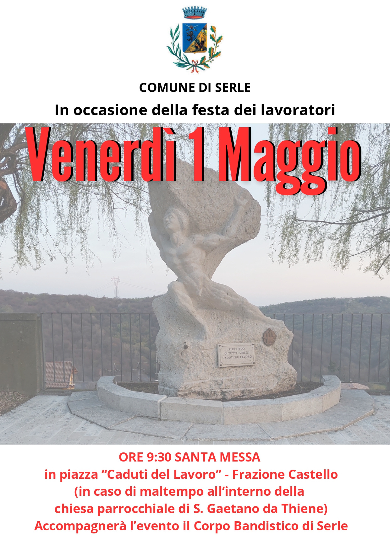 Si invita la cittadinanza a partecipare alla celebrazione della Santa Messa venerdì 1 maggio alle ore 9.30 in occasione della Festa dei lavoratori, in Piazza Caduti del Lavoro - Frazione Castello.