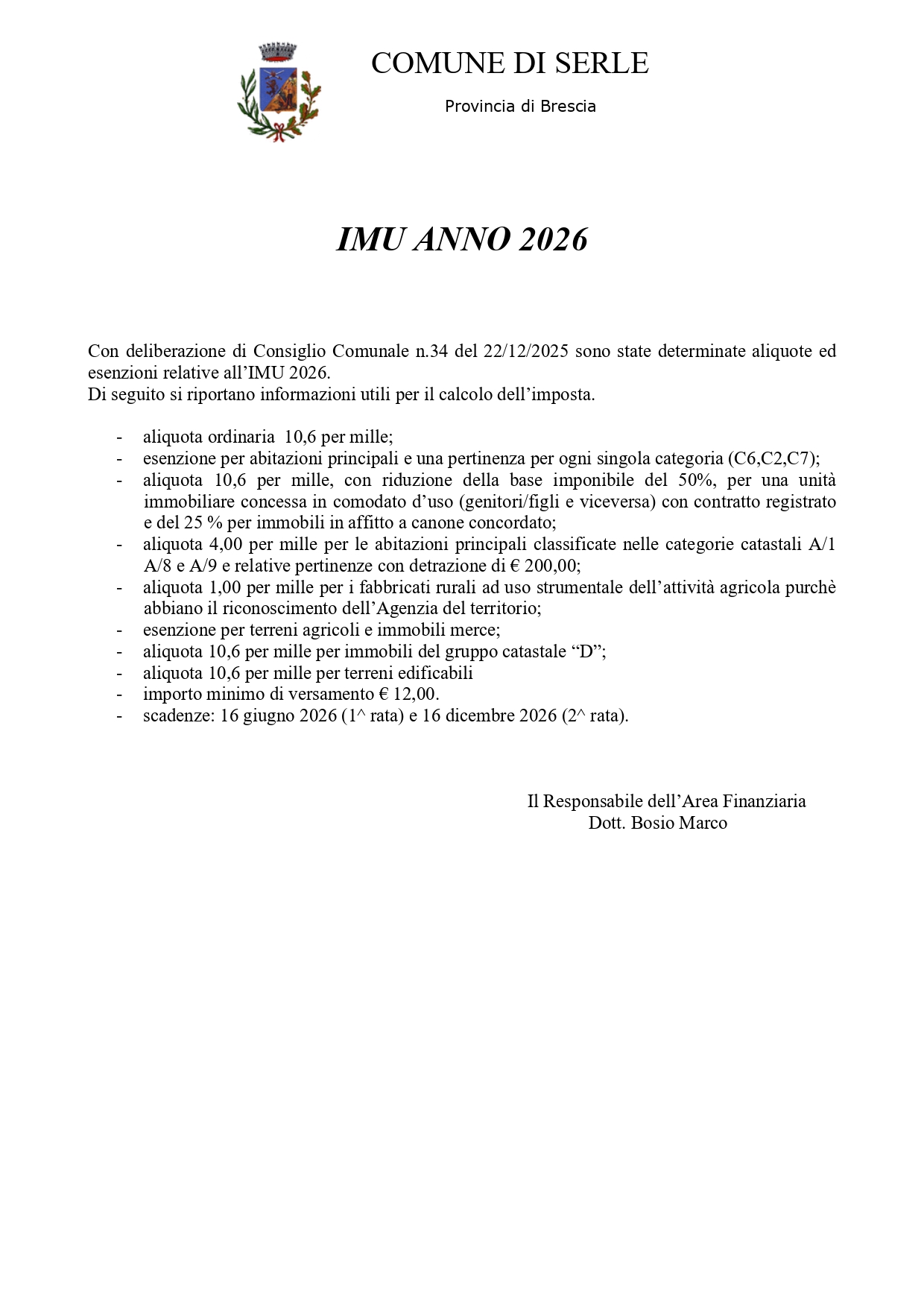 Si avvisa che con deliberazione di Consiglio comunale n. 34 del 22/12/2025 sono state determinate aliquote ed esenzioni relative all’IMU 2026.